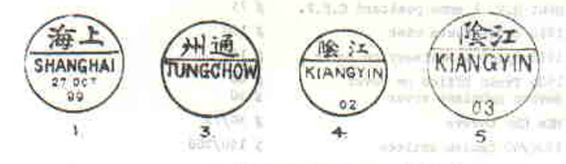 Tungchow (fig.3) has a space for a manuscript date but at Kiangyin the year was incorporated into the cancel, with the day and month being added by hand or by rubber stamp. No less than three types of this kind were used, with strikes with 1901 dates having a diameter of 29mm and capitals 3½mm high. In 1902 a much smaller date appeared (fig.4) and finally in 1903 there was a return to a diameter of 29mm, but this time the capitals were 5mm high (fig.5).